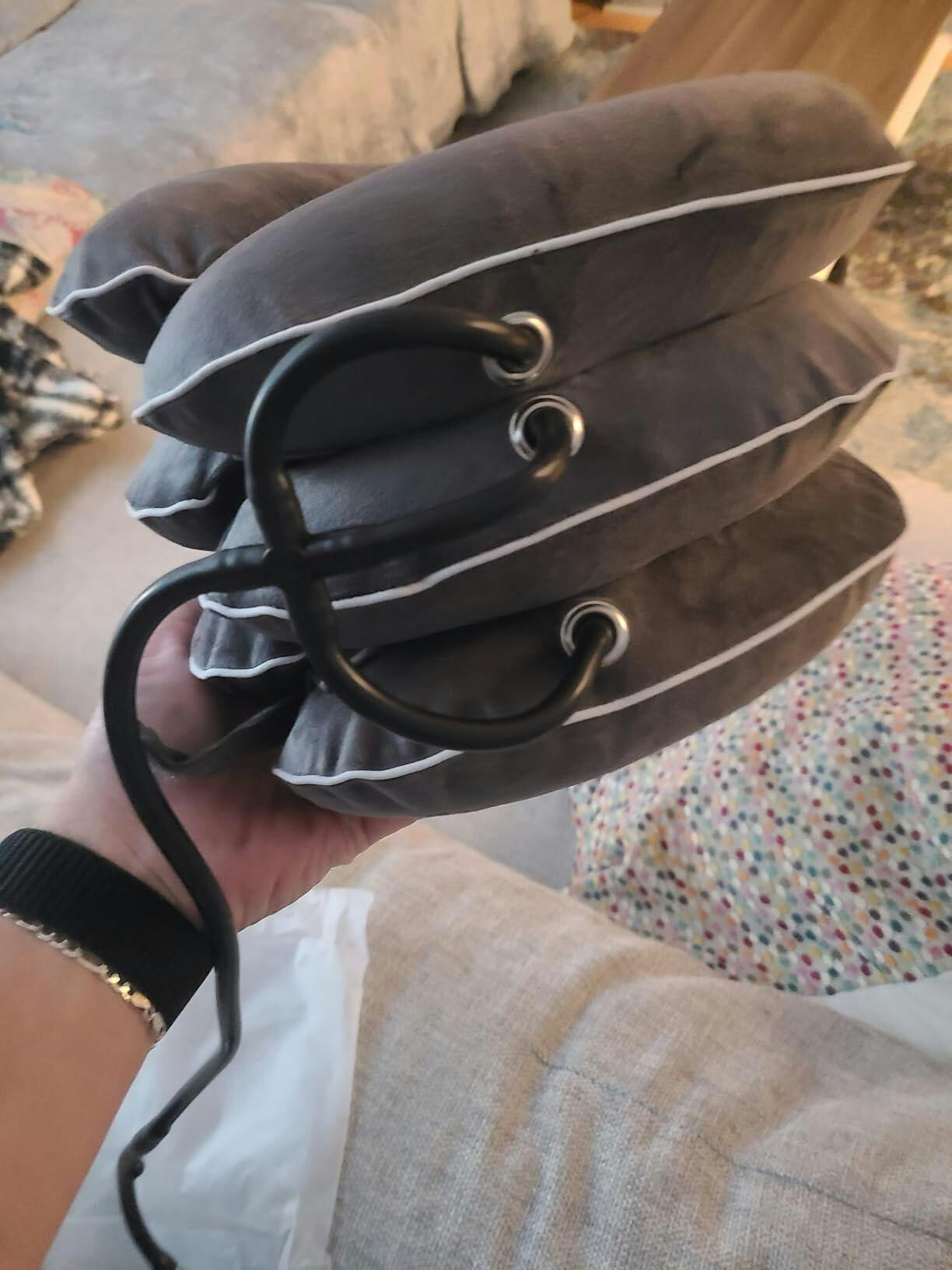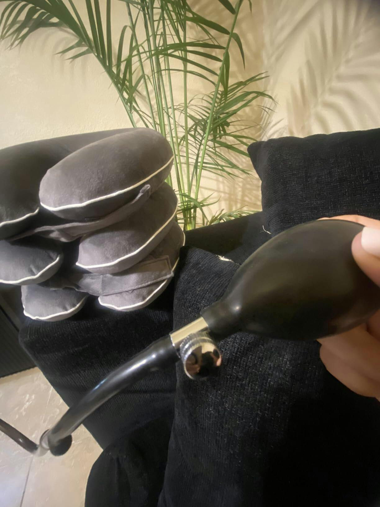 The outer material is so smooth and soft — it doesn’t irritate my skin at all. It wraps comfortably around my neck, and the little pump lets me inflate it slowly until it feels just right. The stretch is noticeable but never painful; it honestly feels like someone gently lifting your head, which is surprisingly relaxing.